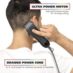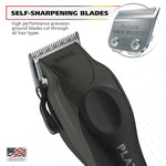 High performance corded hair clipper and trimmer provide precision haircutting with self-sharpening blades and a constant stream of power. The hair clipper contains an adjustable taper lever for easy blending and fading. The trimmer is perfect for quick touch up trims around the ears and neckline.