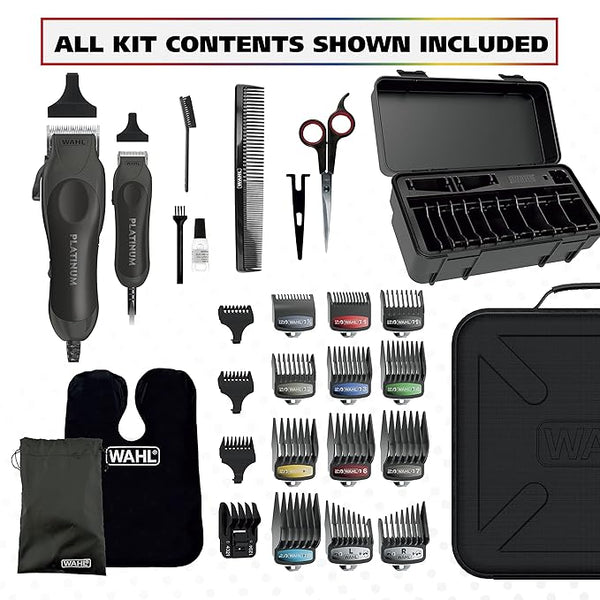 The kit comes with 12 color coded haircutting attachment guards, 4 trimming attachment guards, a guide comb storage case, draw string storage pouch, 28" x 40" Barber Cape, Styling Comb, Large Cleaning Brush, Scissors with Blade Guard, Blade Oil, Small Cleaning Brush, and Large Handled Storage Case.