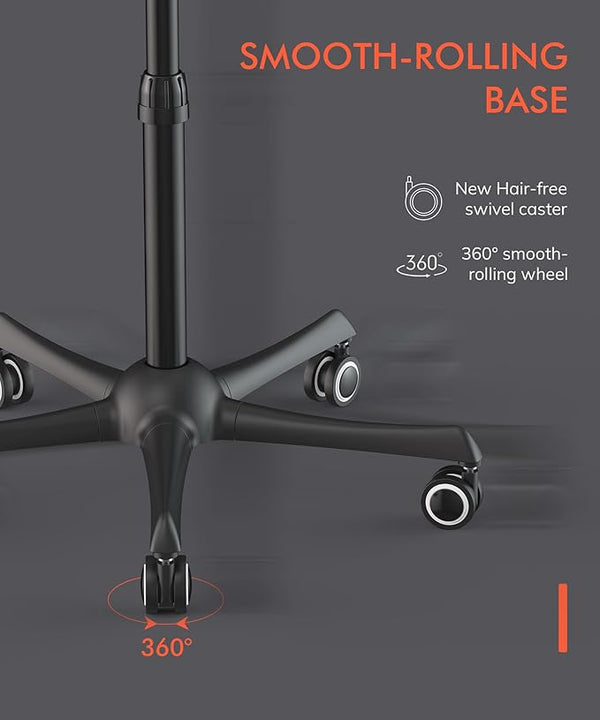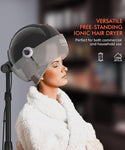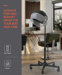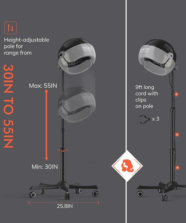 ? ROLLING BASE FOR EASY MOVEMENT: This overhead dryer for hair features a convenient height-adjustable stand with 9ft cord clips and is easy to carry around on the smooth-rolling base.