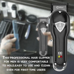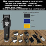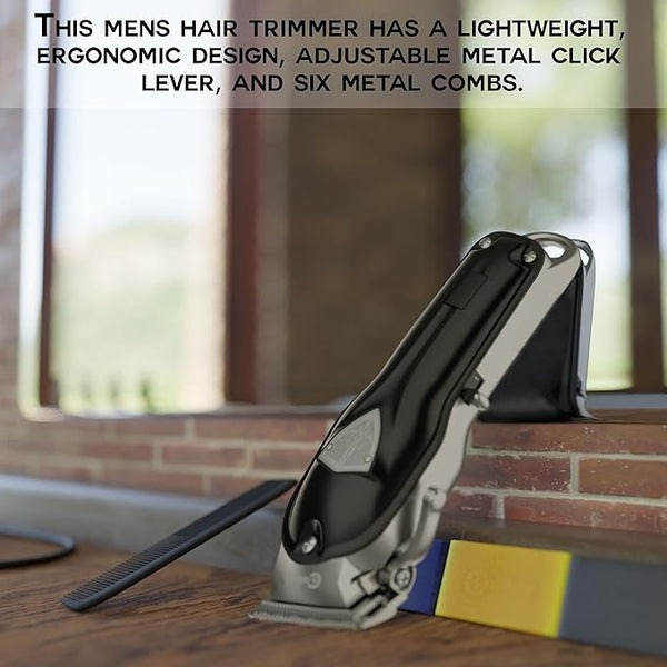 Perfectly and efficiently cut hair, shave beards and mustaches with the Caliber .44 Magnum FMJ Cordless Clippers Kit! You can be confident that you will achieve the perfect cut, trim, fade, taper, and blend with this premium professional hair trimmer for men. A favorite of barbers and stylists, this trimmer not only gets the job done but does so with style and precision every time. The Magnum FMJ was designed specifically to be the best at removing bulk, detailing, and fades. This hair and beard trimmer features an adjustable metal click lever for ultimate length precision, and the lightweight, ergonomic design makes it perfect for professionals and home barbers alike. These clippers are ideal for a range of hairstyles for men, women, and kids, with dual DLC-diamond Like metal 440C Japanese steel blades and six metal combs that resist corrosion and stay cool, sharp, and efficient for longer. Enjoy the Caliber .44 Magnum FMJ constantly for hours on end with the 3200mAh lithium-ion battery that gives you five hours of uninterrupted hair cutting. The package includes non-slip grips, oil, cleaning brush, and comb guards, making the Caliber .44 Magnum FMJ Cordless Clipper Kit the perfect tool for daily professional or home use.