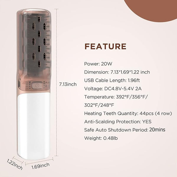 Our hot comb cordless hair straightener has a safety cover to protect the comb teeth and avoid touching the switch, it is safe to carry in bag. This mini straightener is easy to be charged by USB, no need to plug to a socket. There is no noise during using our usb rechargeable hair brush. With MCH technology, this portable hair straightening brush heats up fast, can straighten and curl hairs. We recommend you use it on dry hair.