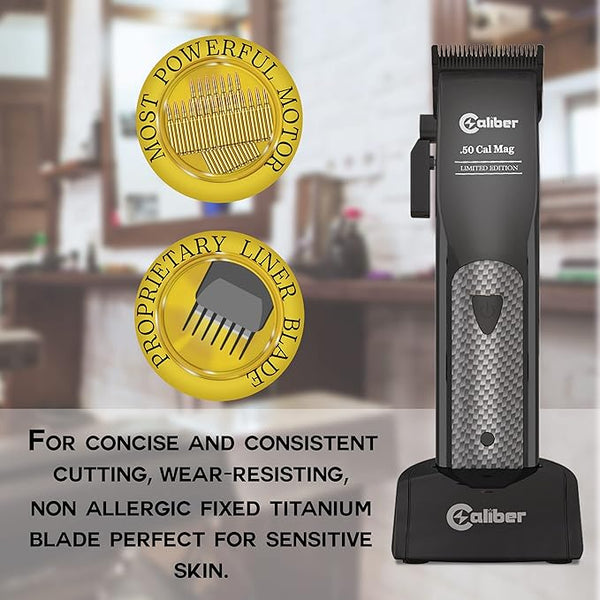 Experience the world's fastest 10w Japanese linear magnetic motor with Caliber .50 Cal Clipper! This powerful motor gives you more than 10,000+ rpm for smooth hair cutting. Our professional hair clippers for hair cutting have a rechargeable 6700 mAh li-ion battery that can provide more than 8 hours of constant power. That means more than eight hours of cordless hair trimming and cutting! The hair and beard trimmer have a low battery indicator light so you'll know when it's time to charge! Easily charge the clipper with its USB cord charger. Our hair trimmer for men has a Japanese 440c stainless steel blade and friction-free dual DLC black diamond coated blade that stays cooler longer, retains sharpness, and stays rust-free. The professional hair trimmer has sharp, rust-free blades that avoid pulling of hair while you clip or trim which is best especially when you use the clipper on your face to remove facial hair so it won't irritate the skin. The precision blade can also be adjusted and zero gapped to give you a cut that's close to the surface without irritation unlike ordinary shaver or razor tools. The Limited Edition .50 Cal hair clippers for men and women are integrated with Ultra-Low Noise technology, reducing the noise it emits while cutting the hair to give you and your client a comfortable and quiet cutting. The Caliber .50 Cal Clipper is made of high-quality materials and is built with high standards so it's durable and can last for many years!