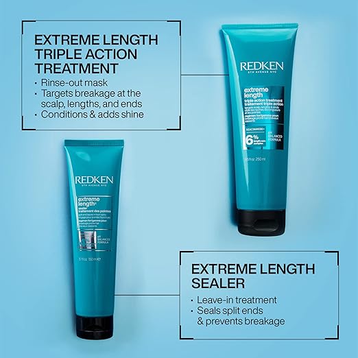 Does your hair have trouble growing longer due to damage? Redken's Extreme Length system with Biotin helps hair grow longer by preventing breakage and keeping mid-lengths to ends of the hair strong. This haircare system features Redken's Length Care Complex made with Biotin and Soy Protein. This system strengthens from your roots to the tips of your hair to help it continue to grow and reduces hair breakage by 81% when used as a complete system.