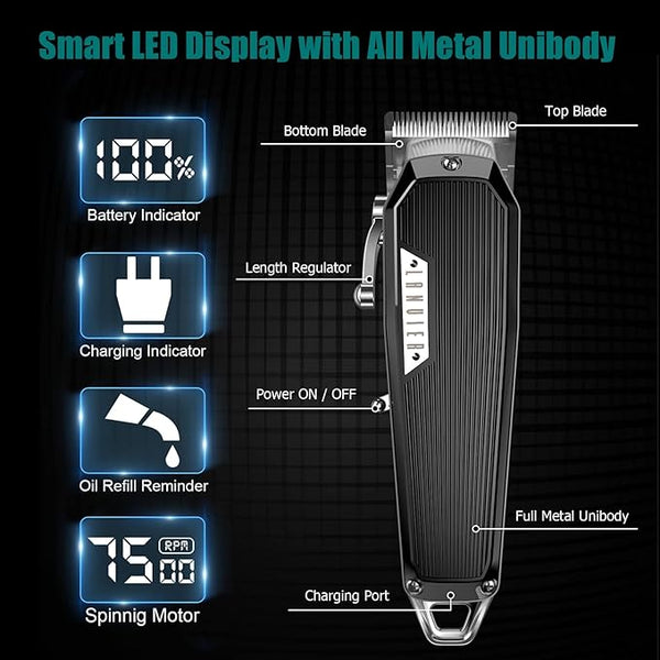 The LED display od this home barber kit reports not only battery level and rotation speed, but also periodic reminder to oil the blades. The whole body of our hair trimmer is made of metal casing ensures durability and longevity.