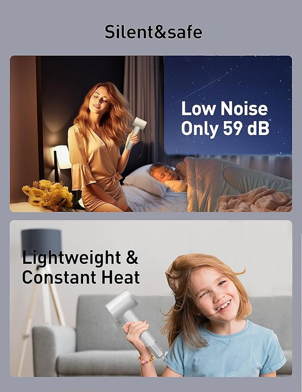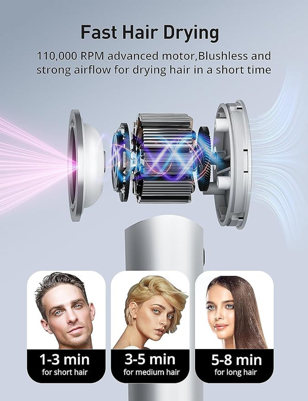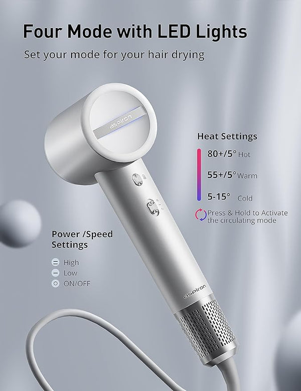 Say goodbye to frizz and hello to gorgeous hair with the Aspiron high-speed hair dryer. Utilizing an advanced 110,000 RPM brushless motor and releasing 200 million negative ions, this travel hair dryer enjoys a 50% faster drying speed and 50% smoother results while reducing unwanted frizz by 60%. Four heat settings cater to your needs with just the touch of a button. The compact, stylish and lightweight design makes it an essential for homes, the office, vacations, business trips, etc.