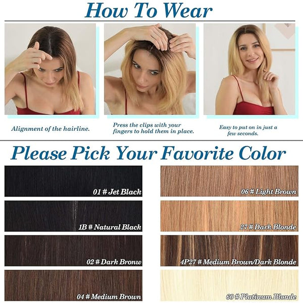 Hair toppers have a natural look that gives you charm and confidence. Soft, thick hair toppers are easy to quickly create different looks in minutes. Hair toppers add length and volume to your hair, giving you a fuller look. Reject glue and tape, zero damage to hair and scalp, take care of your scalp health, just use BB clips and it blends perfectly with your natural hair.