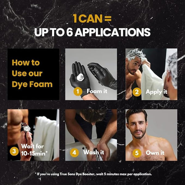 Our foam makes it a breeze! Spray, apply, and voila! Watch your gray fade into your dream color in just 25 minutes. Feel like keeping that salt-and-pepper charm? Just wash it out a bit early! Need darker coverage? Try our True Sons Dye Booster!