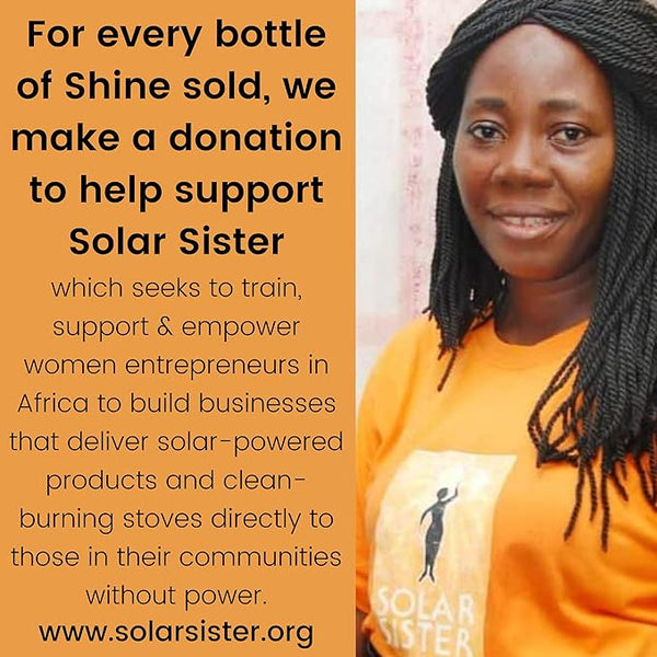 A BEAUTIFUL COLLABORATION: For every bottle of Shine sold, we make a donation to help support Solar Sister which seeks to train, support & empower women in Africa to build businesses that deliver solar-powered products and clean-burning stoves directly to those in their communities without power.