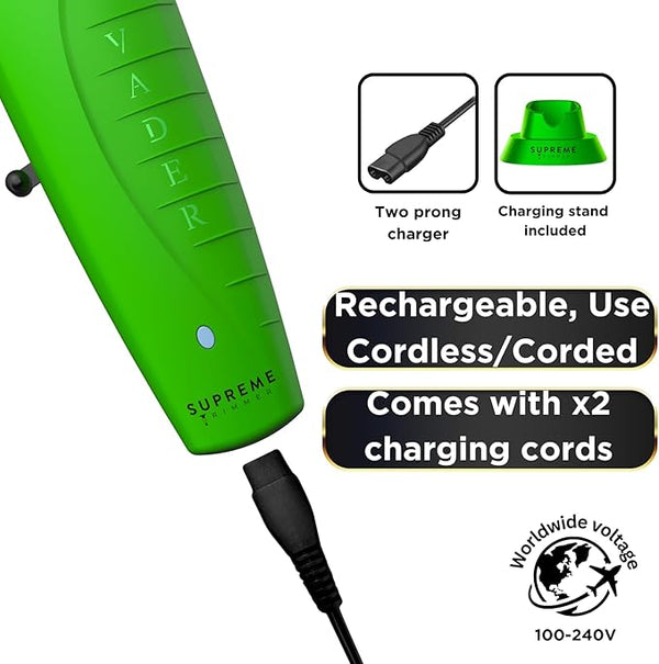 VADER Clipper is equipped with Sharp DLC Taper Blades, which seek to cut straight lines & can be used for de-bulking. Our cordless hair clipper includes everything you need for a user-friendly head, beard, mustache and all hair types trim.