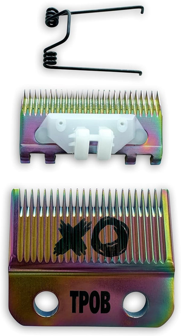 TPOB XO Blade with DEEP CHUNKY tooth moving blade suitable for TROLL and X/XO Clippers as well as all other leading brands Features: TItanium Blades DEEP CHUNKY moving blade for closest and smoothest fade yet Treated Blade Surface Stays Rust free stays cooler longer Fits TROLL/X/XO Clippers & all other leading brands Please note cam follower is for the TROLL and X /XO Clipper