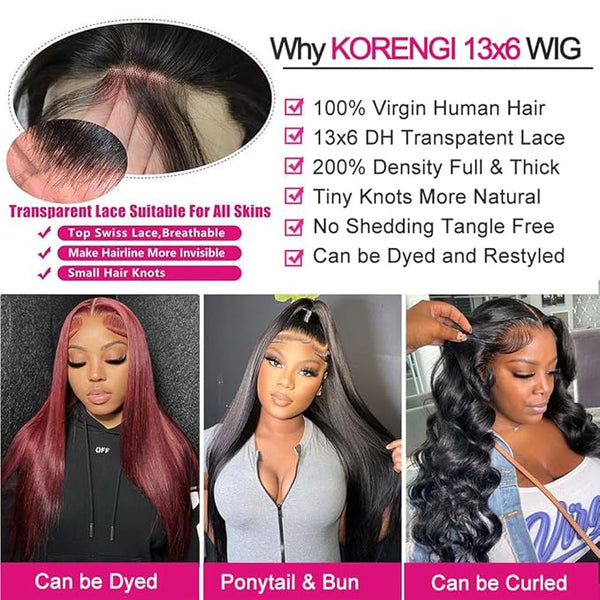 Korengi 13x6 Lace Front Wigs Human Hair 200% Density Straight Wig Details