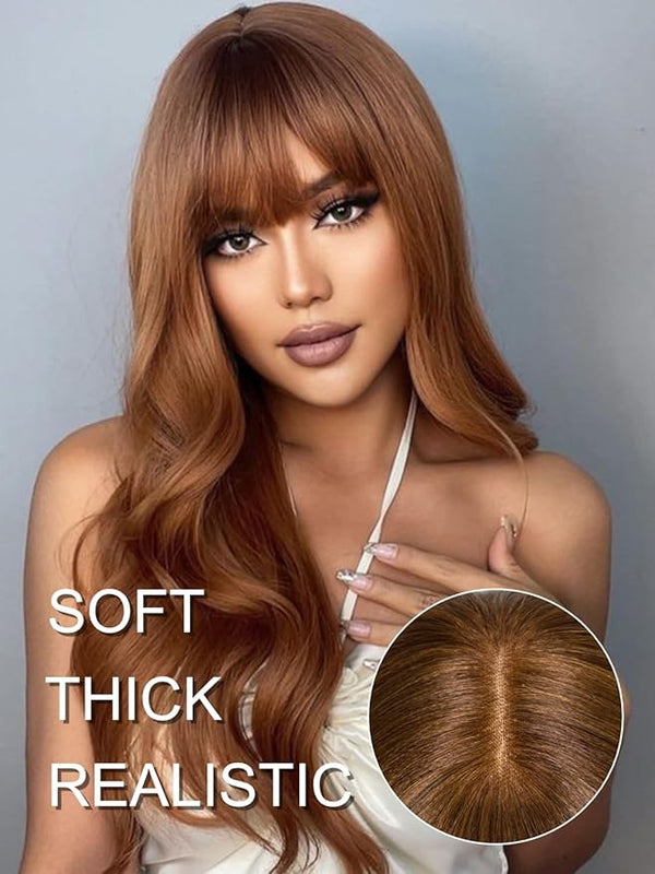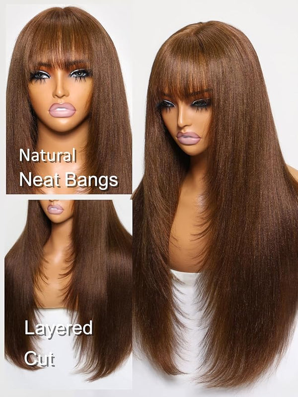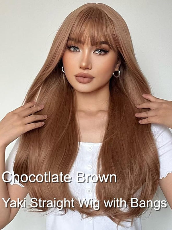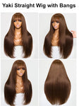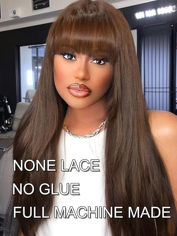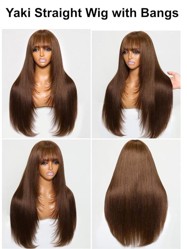 YIROO Chocolate Brown Yaki Straight Human Hair Wigs with Bangs
