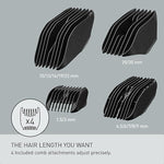 4 included combs make sure that hair is cut smoothly; the the combs' straight-tipped design guides hair and prevents clogs.
