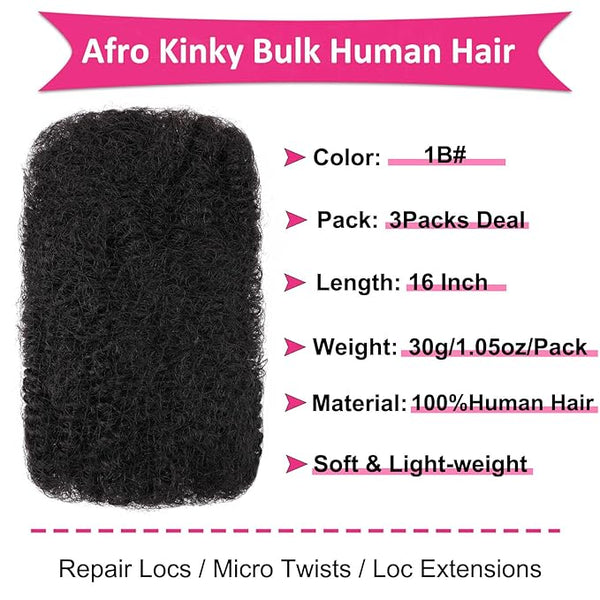 Afro Kinkys Bulk Human Hair, Soft to The Touch, No Smell, Can be Bleached and Dyed, Blend with Your Own Hair, Looks Very Natural.