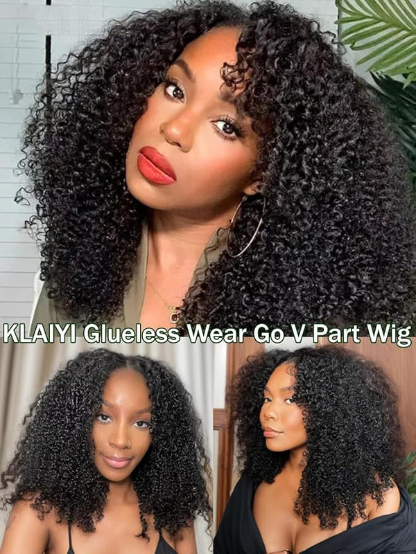 KLAIYI Glueless V Part Kinky Curly Wig Human Hair Wig Put On and Go
