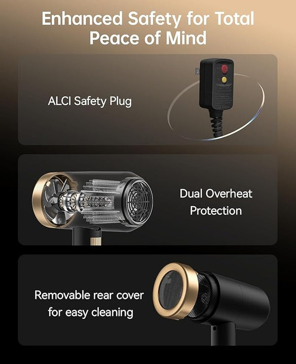 Product descriptionconfu hair dryerCorded ElectricALCI Safety PlugRemovable back coverCompact DesignSuitable for a variety of settings.Cable length: 70.87in.Dual Overheat Protection Enhanced Safety for Total Peace of Mind.Newly upgraded removable filter for...