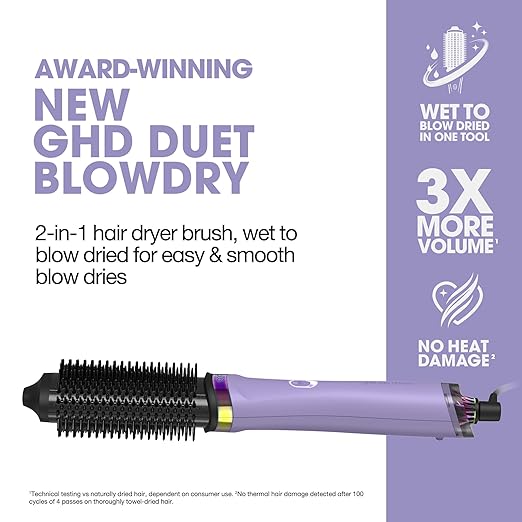 The ghd duet blowdry is ghd's 2-in-1 hair dryer brush that simultaneously dries hair and adds shape.