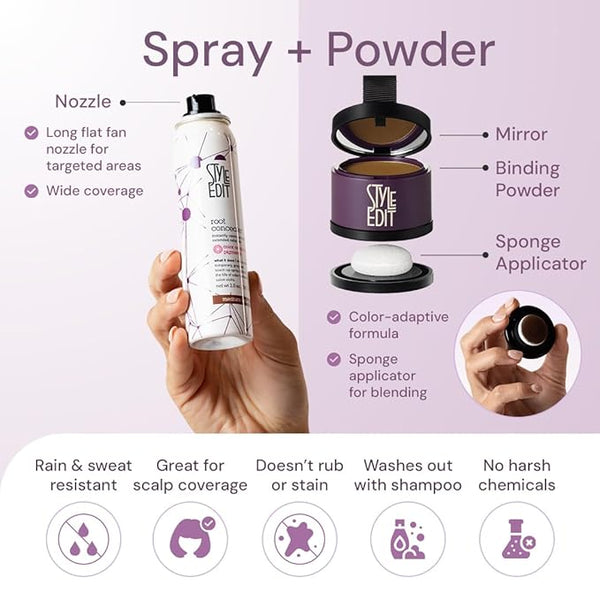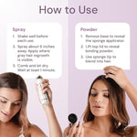 Spray: Hold 6" away, target roots, let dry. Powder: Dab sponge on scalp at part/hairline. Use together for precise, full coverage on the go.