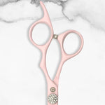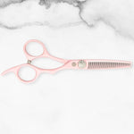 The 440C stainless steel blades are designed for exceptional sharpness, durability, and corrosion resistance, making them ideal for professional use. The sleek finish enhances the refined look of the shears, while the sophisticated pink handle adds a touch of elegance and individuality. This combination of high-performance steel and striking design creates a pair of shears that not only deliver precision and reliability but also stand out as a statement of craftsmanship and style. These shears offer the perfect balance of functionality and aesthetic excellence, making them a must-have for stylists who value both performance and appearance.