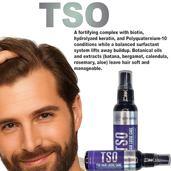 TSO by adn-natural is a lightweight botanical tonic designed to support a healthy scalp environment and stronger-looking hair. Its advanced blend of botanical extracts, amino acids, and Biotinoyl Tripeptide complex helps nourish follicles, support circulation, and maintain optimal scalp balance for daily vitality. Infused with Rosemary, Ginkgo Biloba, Camellia, and Batana Extract, TSO hydrates the scalp and fortifies roots without weighing hair down. Regular use helps improve the appearance of thickness, strength, and shine ? ideal for men and women seeking a clean, revitalized scalp and refreshed hair from the very first application.
