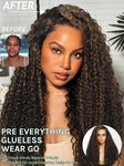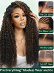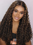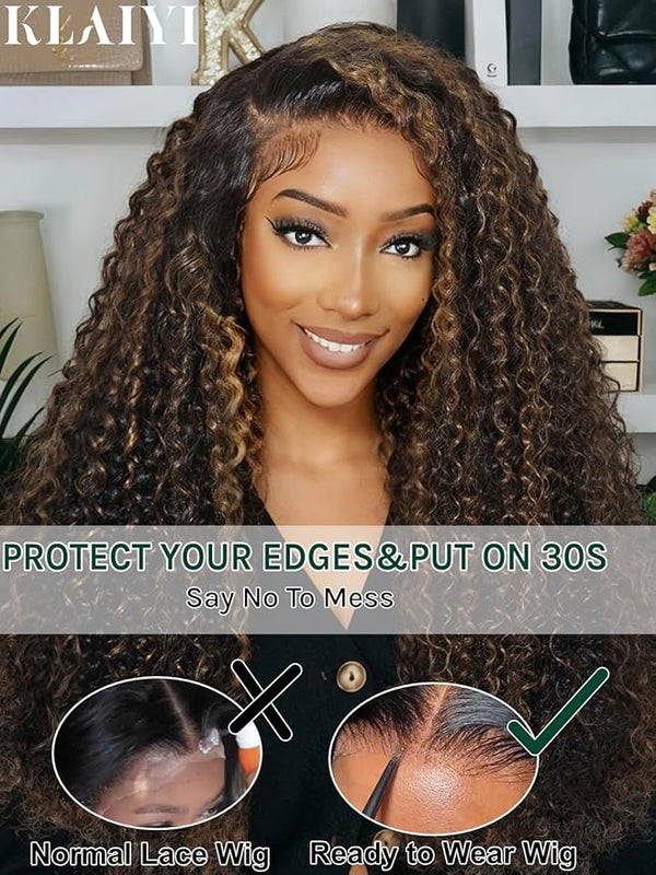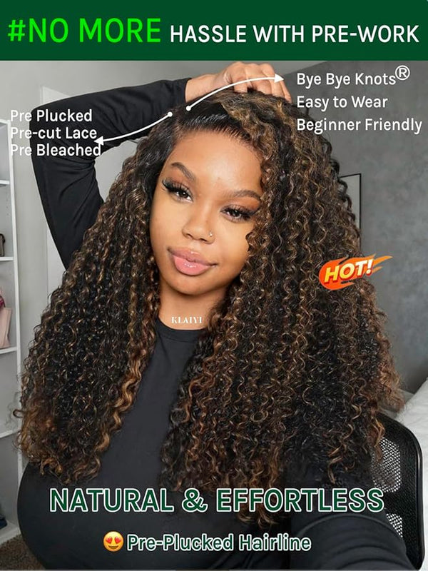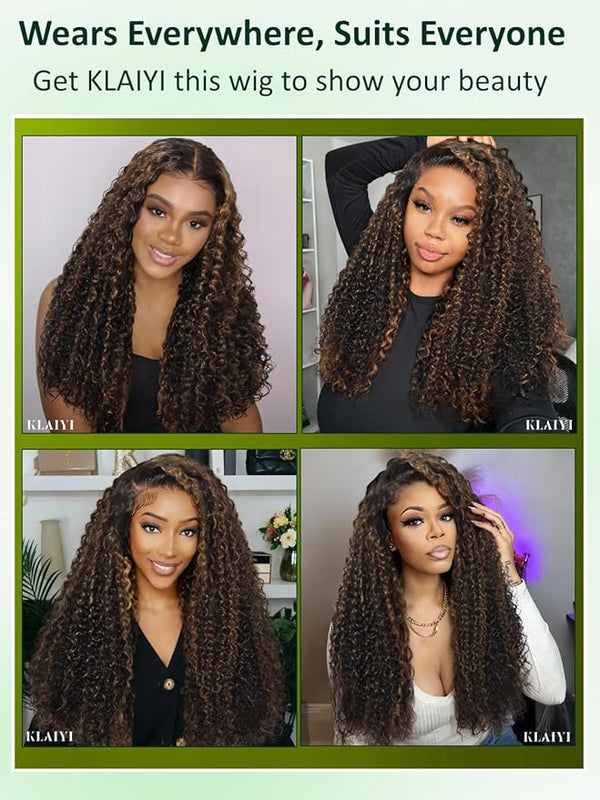 KLAIYI Golden Brown Highlights Curly Bye Bye Knots Glueless Wigs Human Hair