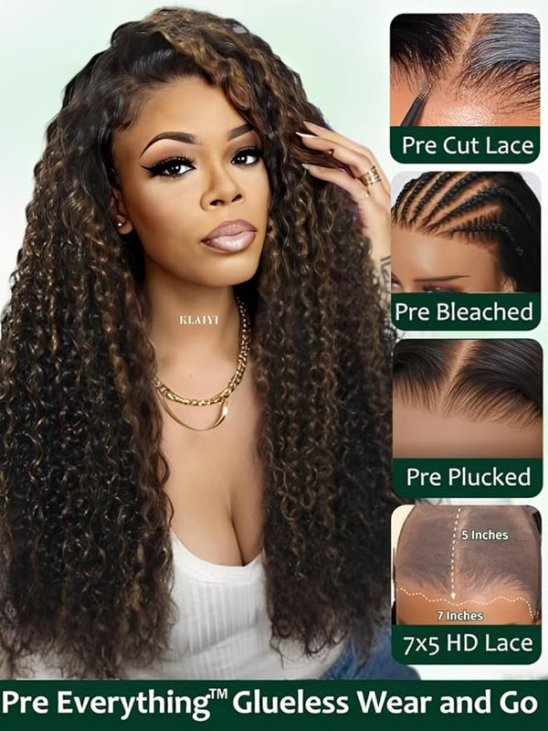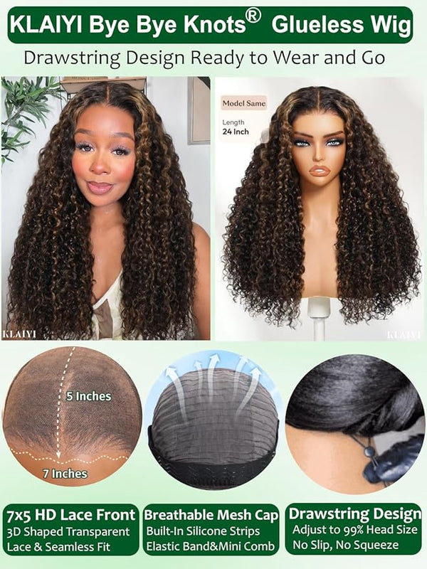 Product descriptionKLAIYI Golden Brown Highlights Curly Bye Bye Knots Glueless Wigs Human Hairklaiyi put on and go glueless wigKLAIYI Precut 7x5 Lace Front Wigs Human Hair Drawstring Highlight Ombre WigKLAIYI...