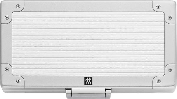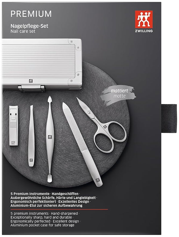 This professional 5-piece Premium nail care set includes the most essential items for effortless manicures and pedicures and quickly and precisely repairing nail damage. The black velvet interior of the exceptionally sturdy aluminium case neatly and securely holds a pair of nail and cuticle scissors, compact nail clippers, a 130mm sapphire nail file, a cuticle pusher and cleaner and slanted tweezers. The incredibly precise workmanship with matte satin-finished stainless steel and the perfect ergonomic design of the tools ensures outstanding longevity and functionality in an attractive design.