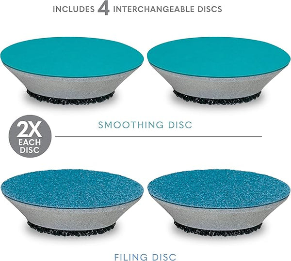 Unique oscillating head with flat grooming discs on a flexible, cushioned foam core, bends to the contours of the foot, allowing for a more comfortable filing experience. Back and forth movement of discs minimizes burning sensation caused by other fast-spinning foot files.