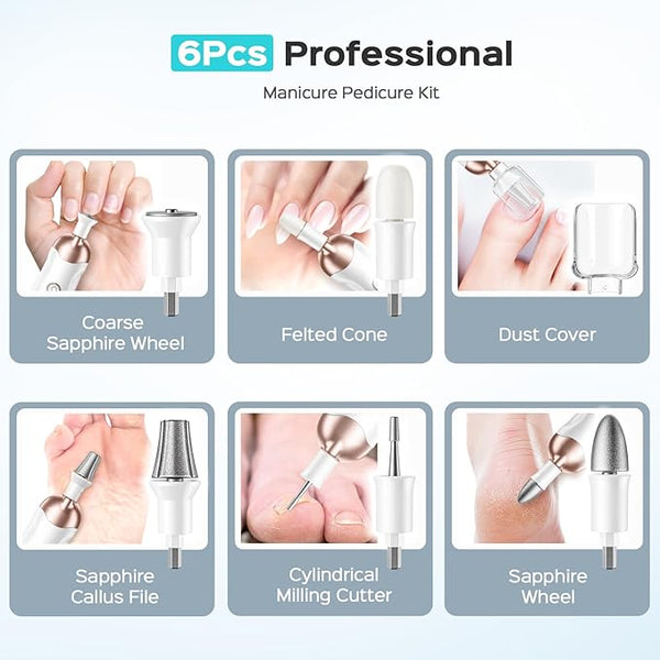COSLUS 5 pcs professional pedicure and manicure set everything you need - equipped with 5 multifunctional stainless steel nail drill bits, a Type-C charging cable, an integrated LED light for precise filing, and a dust cover.