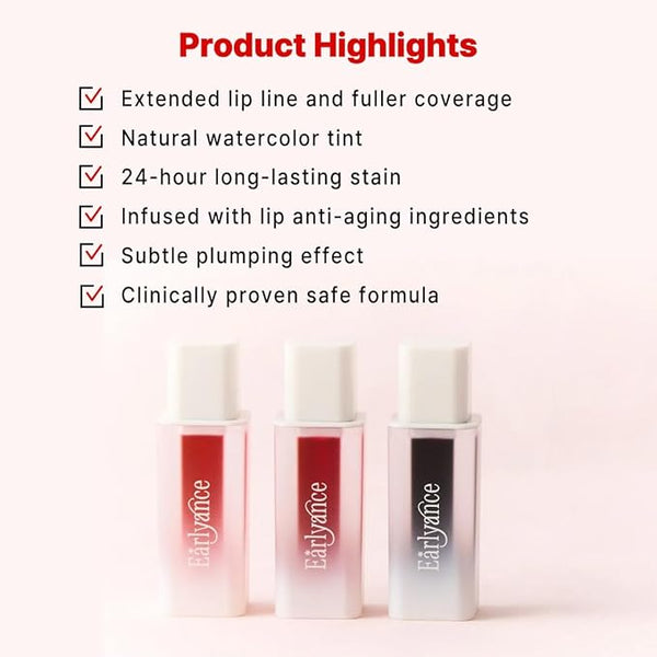 Naturally tinted, 24-hour lip stain by Earlyance. No smudging, no transfer?just fresh, lasting color for busy, beautiful days. Experience the revolution in long-lasting lip color with Earlyance's Korean Water-Based Lip Tattoo Stain. This innovative peel-off lip tint combines the best of K-beauty technology with practical everyday wear, delivering vibrant, smudge-proof color that truly lasts 24 hours.