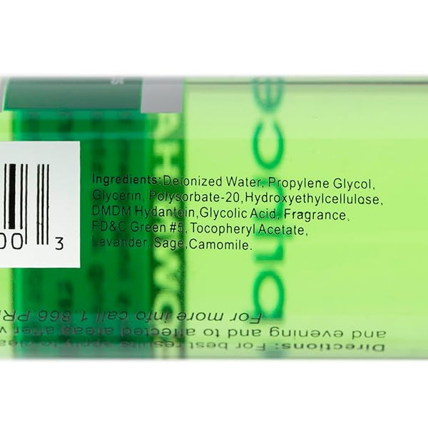 Deionized Water, Propylene Glycol, Glycerin, Polysorbate-20, Hydroxyethylcellulose, DMDM Hydantoin, Glycolic Acid, Fragrance, FDNC, Green #5, Tocopheryl Acetate, Lavender, Sage, Chamomile, Folliculitis, Spots and Agua desionizada, propilenglicol, glicerina, polisorbato-20, hidroxietilcelulosa, DMDM ??hidantoina, acido glicolico, fragancia, FDNC, verde n. ¡Æ 5, acetato de tocoferilo, lavanda, salvia, manzanilla, foliculitis, manchas.