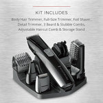 For all your grooming needs: Full-Size Trimmer; Foil Shaver; Nose, Ear, and Detail Trimmer; Vertical Body Hair Trimmer and Body Hair Trimmer Comb; Hair Clipper Comb with 8 Length Settings; 3 Beard and Stubble Combs.