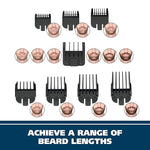 Comes with 4 stubble guards, 3 beard guards, and a 6 position guide for multiple cutting lengths.