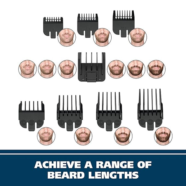 Wahl Groomsman Rechargeable Cordless Beard & Mustache Trimmer with ergonomic contour design and soft-touch elements for a comfortable grip, beard regulator along with bare blades provide 7 trimming lengths as well as an adjustable 6 position guide.