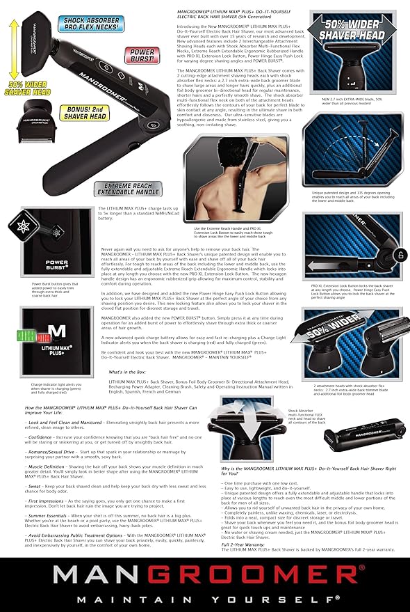 Product descriptionULTIMATE PRO & LITHIUM MAX PLUS+ Back Shaver Complete Attachment Head AccessoryMANGROOMER ULTIMATE PRO Do-It-Yourself Electric Back Hair ShaverMANGROOMER ShaversBack ShaverBall ShaverChest Shaver2 Shavers in 1RechargeableLeg ShaverUnderarm ShaverBack ShaverBall...