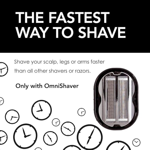OmniShaver is the only shaver that "Self Cleans", meaning that you don't need to stop during your shave to rinse or clean out your shaver. As one set of blades is shaving hair, the opposing set of blades is being dragged back over the skin, which pulls the shaved hair out from in-between its' blades. This makes cleaning or rinsing during a shave unnecessary, which is the reason why OmniShaver shaves so much faster than all other shavers. Once the shave is complete, thoroughly rinse with water and air dry.