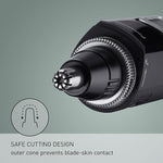 Contoured outer safety cone prevents direct blade contact with skin. As blades rotate, hair is drawn in from the sides and top for quick, clean cutting with no irritation or discomfort. And, cone design helps leave the proper volume of hair to maintain the nose's healthy, natural filtering system.