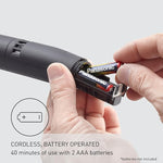 Compact design ideal for everyday trimming and grooming anywhere. Two AAA-Alkaline batteries (not included) provide up to 40 minutes of use.