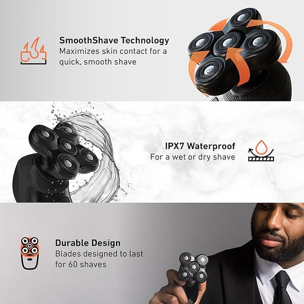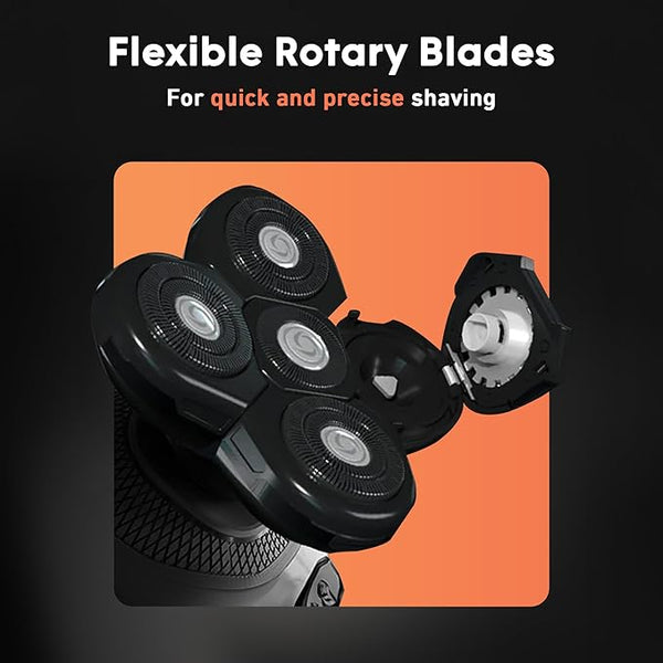 Rotary shavers are much easier to use and handle. Since you can move in any direction, there is no perfect "strategy" to shaving your head. More blade heads means less passes over your skin, resulting in a close shave without any irritation!
