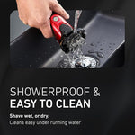 A waterproof design lets you shave dry directly on skin or with shaving cream (or gel) in or out of the shower.