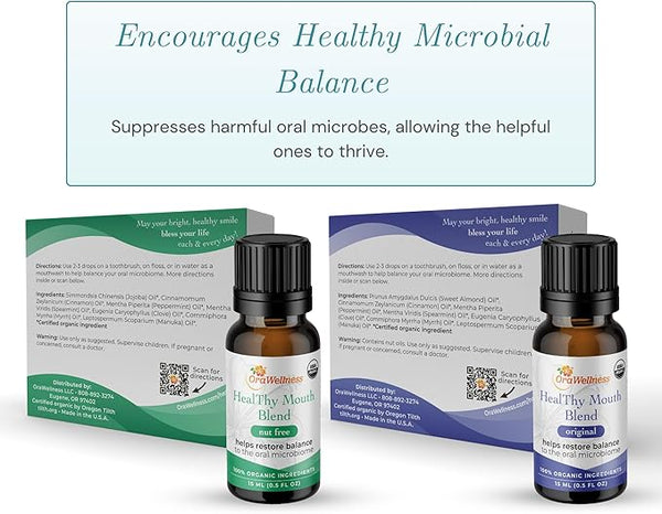 Essential oils must be properly diluted before they're used in or on the body. Our HealThy Mouth Blend comes in two carrier oil options: Original (sweet almond oil base) or Nut Free (jojoba oil base).