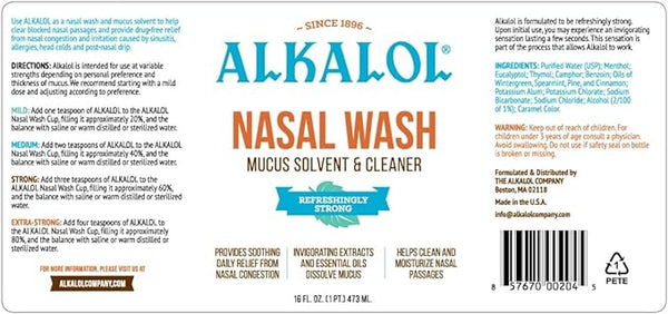 When mucus builds and clogs nasal and sinus passages, it can be hard to breathe. Alkalol Nasal Wash ? the only saline rinse with a proprietary blend of natural extracts and essential oils Since 1896 ? provides invigorating relief from nasal congestion and sinus pressure caused by colds, flu, and allergies. Alkalol is a safe, fast-acting, and refreshingly-strong solution that leaves your sinuses feeling clean and revitalized.