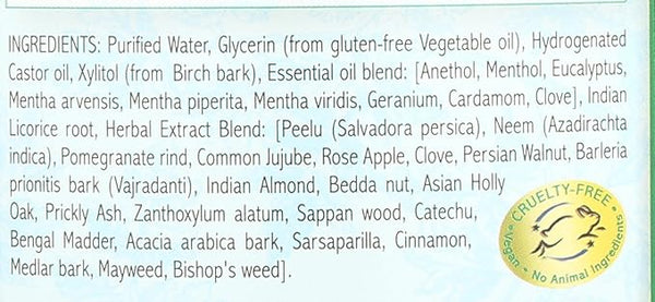 Auromere Mouthwash contains these legendary herbs along with Xylitol (from Birch bark), Anethol, Menthol, Eucalyptus, Mentha arvensis, Mentha piperita, Mentha viridis, Geranium, Cardamom, Clove, Pomegranate rind, Common Jujube, Rose Apple, Clove, Persian Walnut, Barleria prinoitis bark (Vajradanti), Bedda nut, Asian Holly Oak, Prickly Ash, Zanthoxylum alatum, Sappan wood, Catechu, Bengal Madder, Acacia arabica bark (Babul), Sarsaparilla, Cinnamon, Medlar bark, Mayweed, Bishop¡¯s weed], Benzoic acid (Nature identical).
