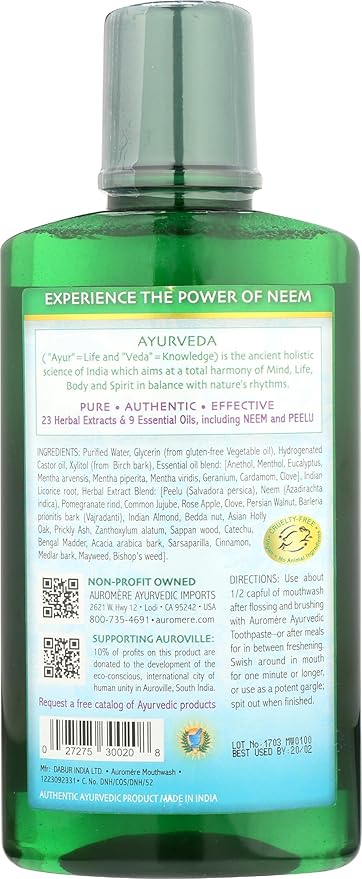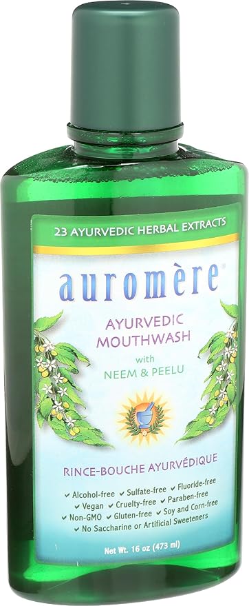 Product descriptionAuromere Ayurvedic MouthwashPure oral hygieneWith Neem, Peelu, & over 20 additional roots, plants, barks and flowersAbout AuromereAyurvedic Dental Care, Skin Care, Hair Care, & more!Auromere Ayurvedic Mouthwash with Neem...