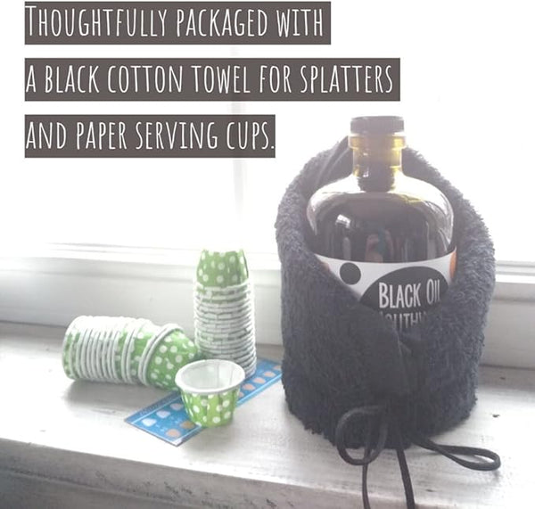 Handmade in small batches, Black Oil Mouthwash is authentically prepared using uncomplicated ingredients; Coconut Oil, Sesame Oil, Avocado Oil, Activated Charcoal, Xylitol, and Organic Essential Oils. Made with love, and thoughtfully packaged with paper serving cups and a black towel to clean up splatters. We bring you an unparalleled oral care product.