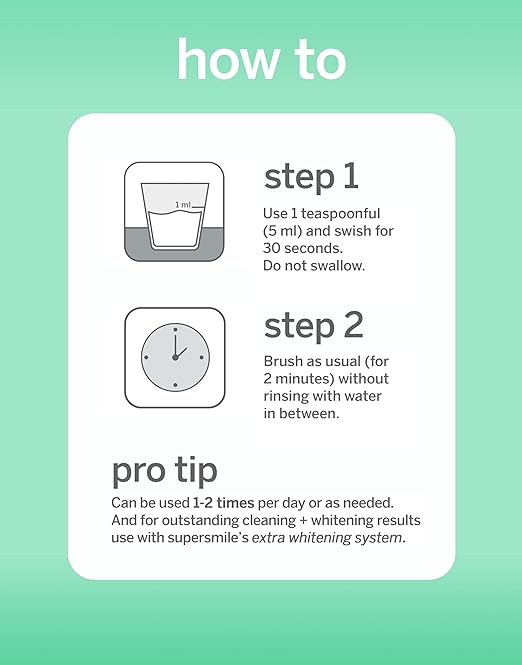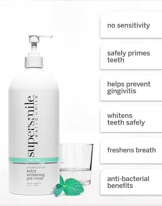 Supersmile Whitening Pre-Rinse preps your teeth for deeper whitening, lifts stains between teeth, and kills odor-causing bacteria. Gentle and effective, it freshens breath and brightens smiles?even on veneers, dentures, and bonded teeth.