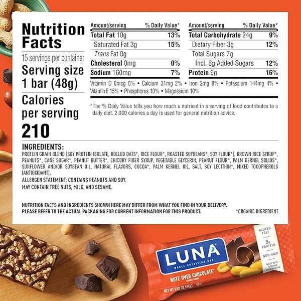 From the manufacturerLUNA Bar Nutz Over Chocolate Flavor Gluten Free Snack Bars, Non-GMO Protein BarsBite into delight with LUNA Bar Nutz Over Chocolate Flavor Gluten Free Snack Bars. Made with...
