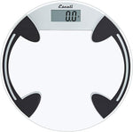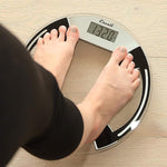 High quality, impact resistant bathroom scale with tempered clear glass round platform and sleek black accents. A bathroom scale that offers both form and function. This modern, round contours act as a work of art in the bathroom.