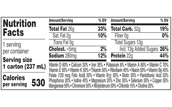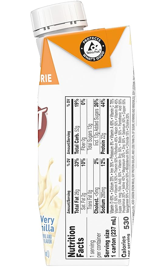 From the manufacturerVery High Calorie Complete Nutritional DrinkBoost Very High Calorie Nutritional Drink provides 530 calories plus 22 grams of protein and 26 vitamins and minerals per 8 fluid-ounce serving....