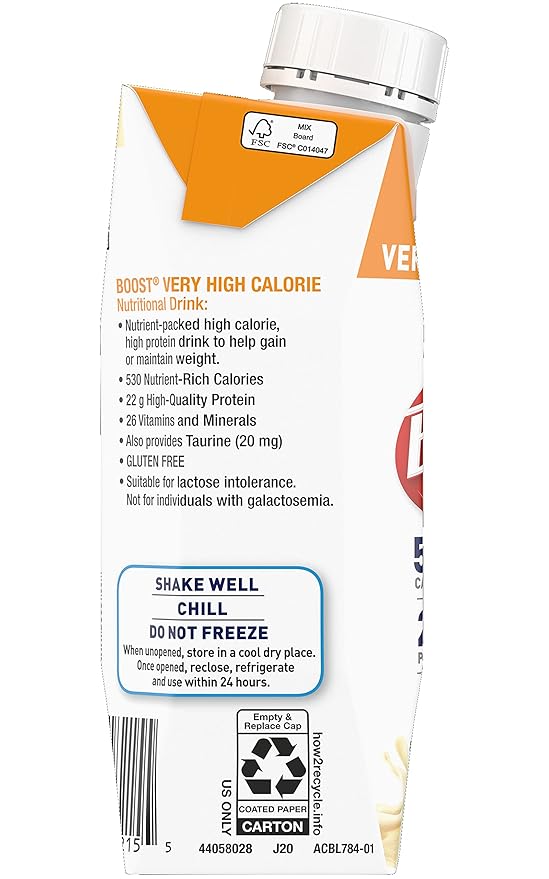 Boost Very High Calorie Nutritional Drink provides 530 calories plus 22 grams of protein and 26 vitamins and minerals per 8 fluid-ounce serving. It is nutritionally dense to accommodate diminished appetites. Available in Very Vanilla flavor, it is best served chilled.